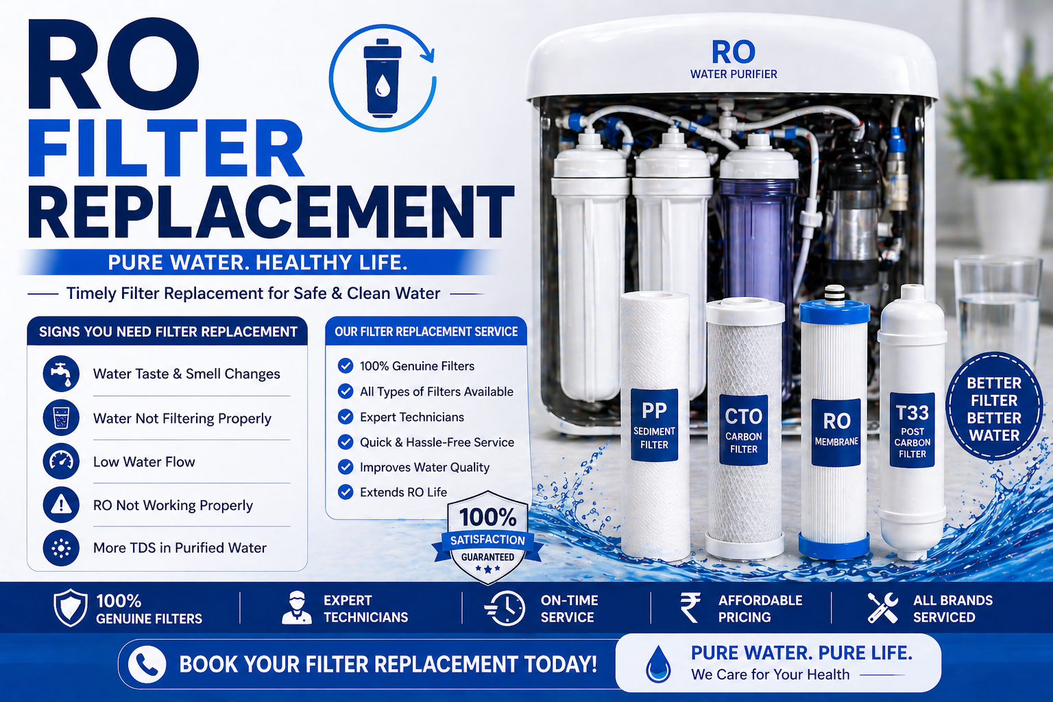 Regular RO filter replacement is essential to maintain clean, safe, and great-tasting drinking water. Over time, filters get clogged with dirt, chemicals, and impurities, reducing purification efficiency and water flow.