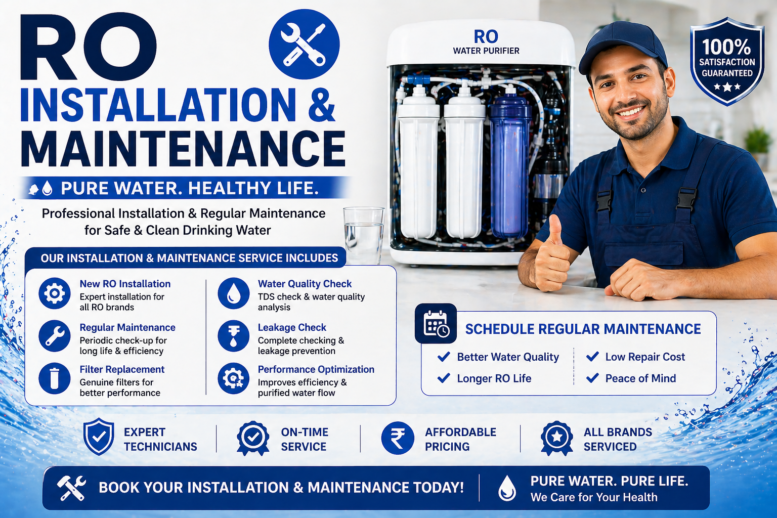 Get hassle-free RO water purifier installation and maintenance at your doorstep. Our expert technicians ensure proper setup, correct water pressure, and optimal performance for safe and pure drinking water.
