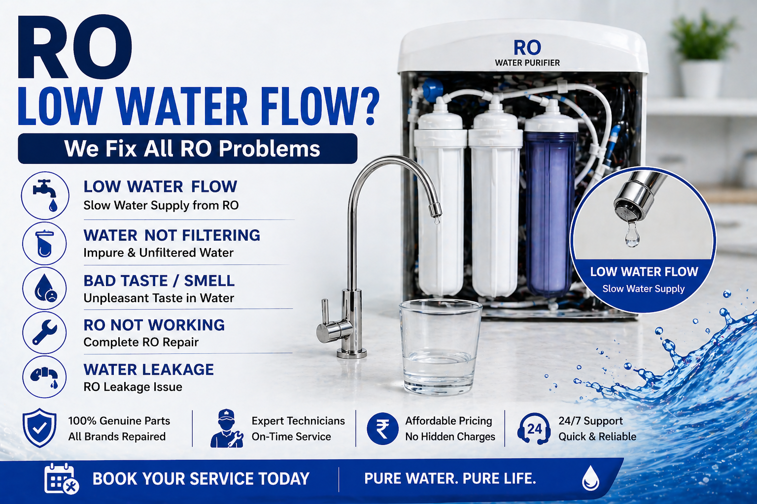 RO water purifier is giving low water flow or slow output, it can be frustrating and may indicate an internal problem. Reduced flow often means your filters, membrane, or pump needs attention.